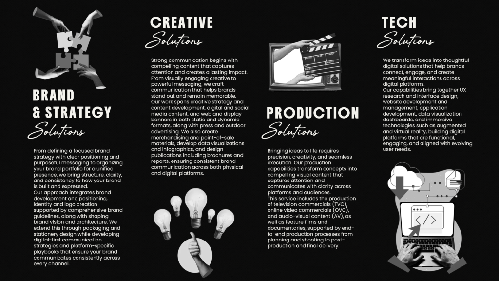 By combining creative thinking with strategic execution, we help businesses move beyond communication and toward lasting influence, building stronger brands, deeper connections, and meaningful impact.
